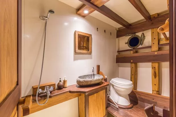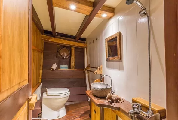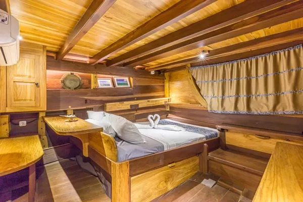 The KLM Teman, an Indonesian phinisi with 5 fully equipped cabins that can accommodate up to 12 people in 3 double and 2 triple cabins. All equipped with an ensuite bathroom, air conditioning, and plenty of storage space.